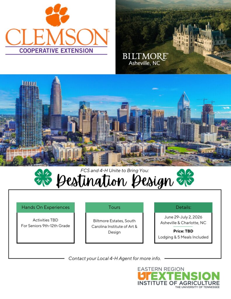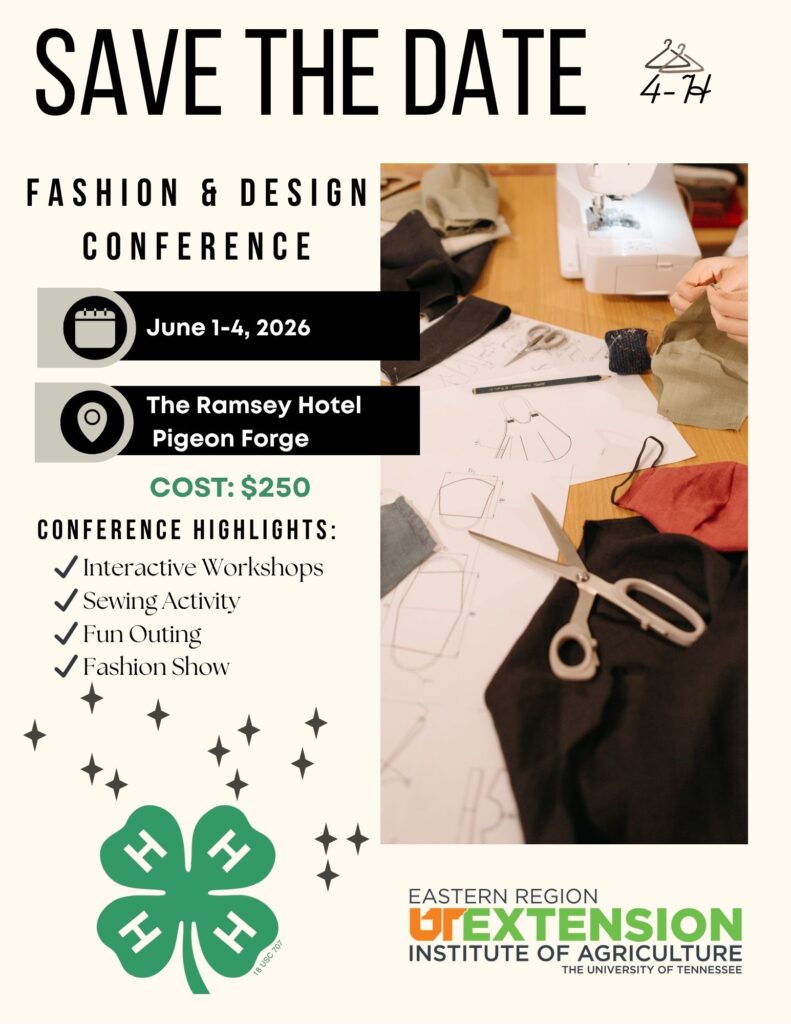 We are excited to announce the 2026 Eastern Region 4-H Fashion and Design Conference will be held June 1-5th, 2026 at The Ramsey Hotel Pigeon Forge, Tennessee. Contact one of the 4-H agents listed below.
