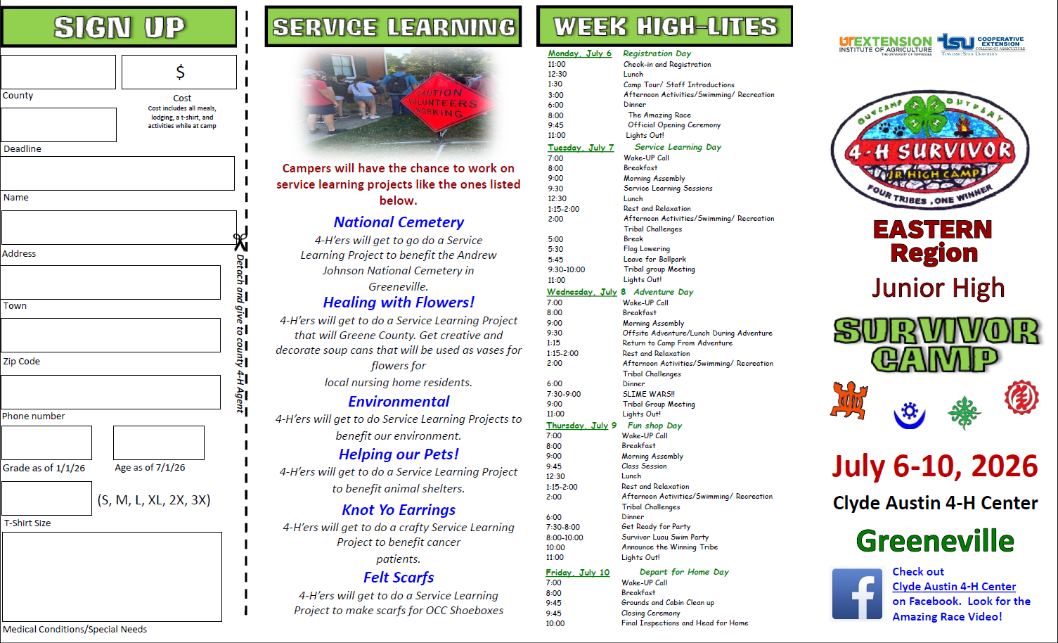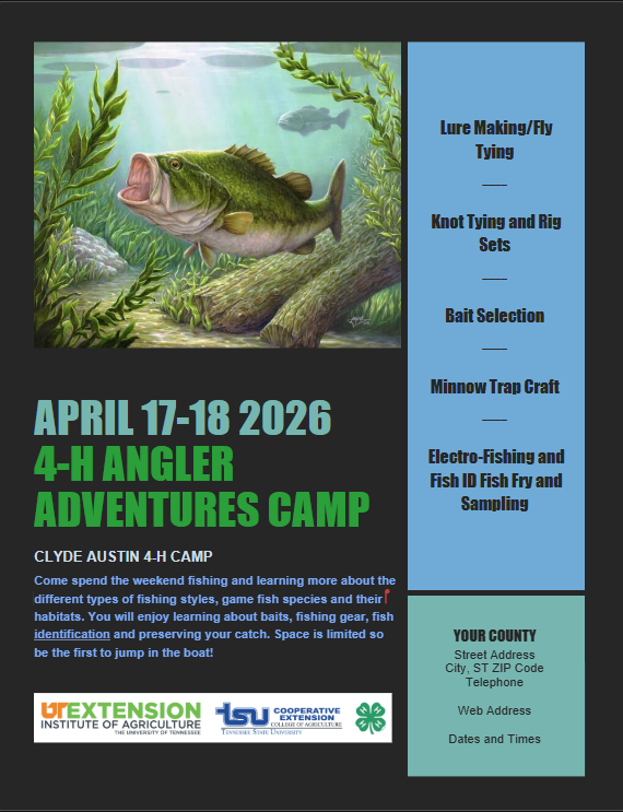 Just as a reminder, camp will be held June 23rd-25th, 2026 at the Clyde Austin 4-H Center Lodge in Greeneville, TN. The cost to attend camp is $250.